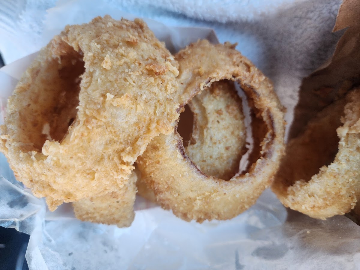 Onion rings were the best I've ever had. Huge and crispy all the way though. Amazing juicy burgers. Chicken gizzards were amazing. Fries were a little soggy. Overall great food